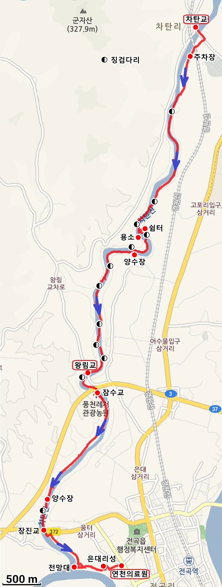 ♣ 코스 : 차탄교-주차장-쉼터-용소-왕림교-잠수교-징검다리-장진교-삼형제바위 전망대-은대리성-연천의료원 <10.4km>
