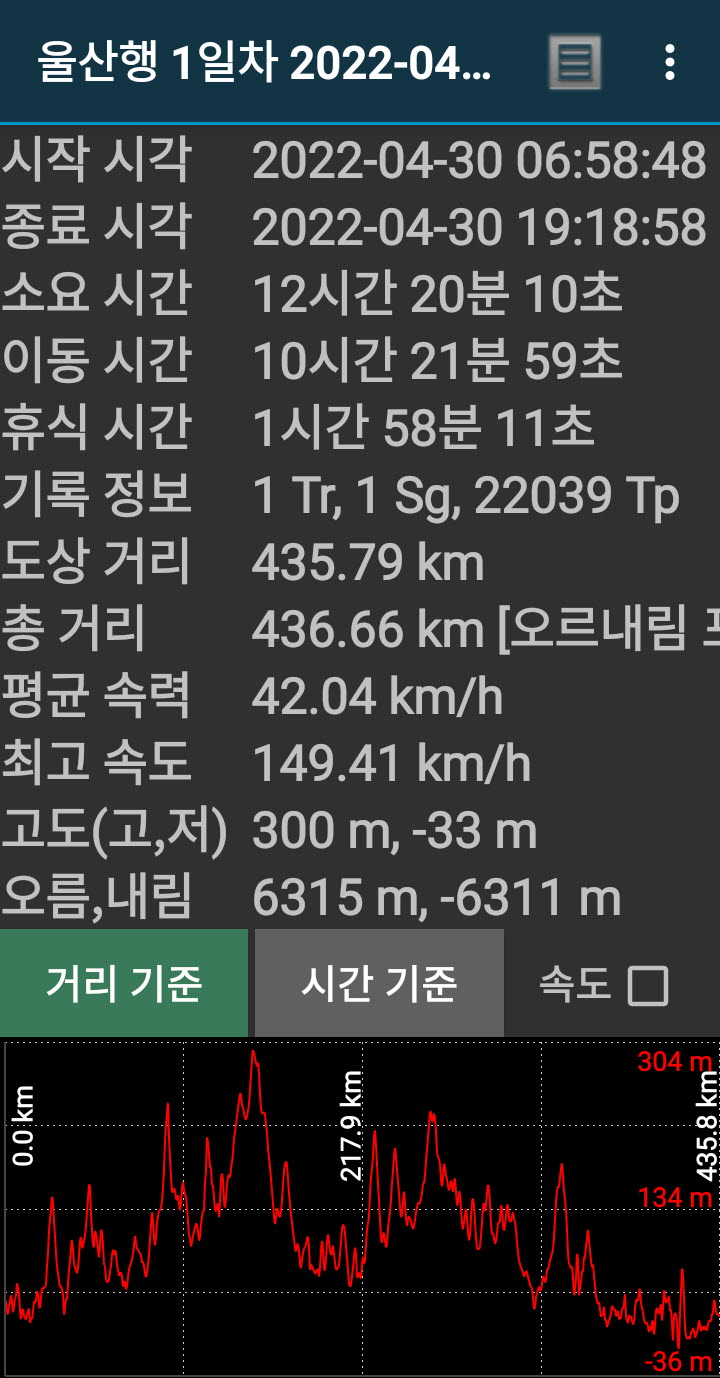 중식(김밥)-17:19 사연리 발(418km)-19:48 괴산휴(22')주유-22:40 집 착 (773km)