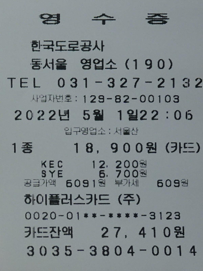 2) 통행료 : 구리(2회) 1,600 동서울-경주(영천JC경유) 17,300