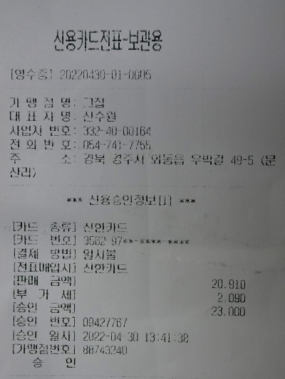4/30<충주휴게소> 설렁탕 8,000 유부우동 5,500 ₩13,500