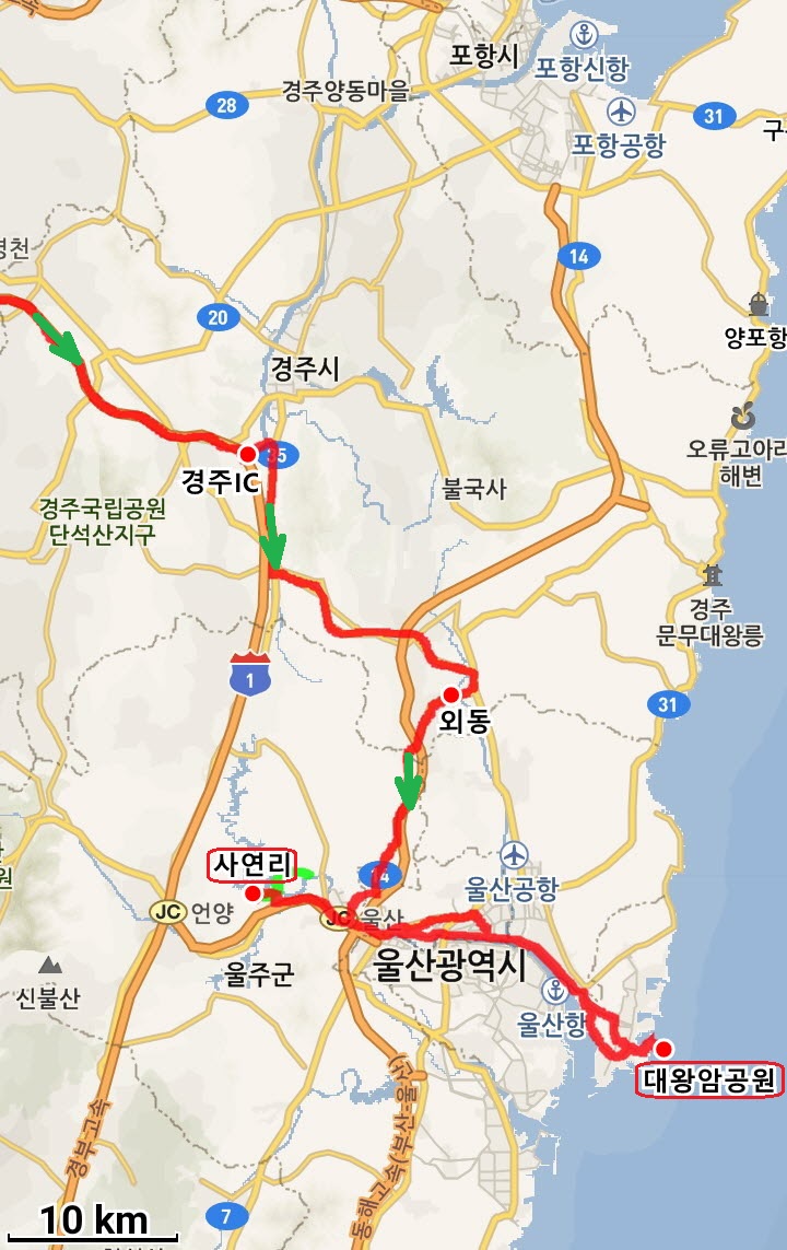 ◎ 범례 : 녹색 표시(→)는 울산 접근코스, 황색 표시(→)는 상경코스