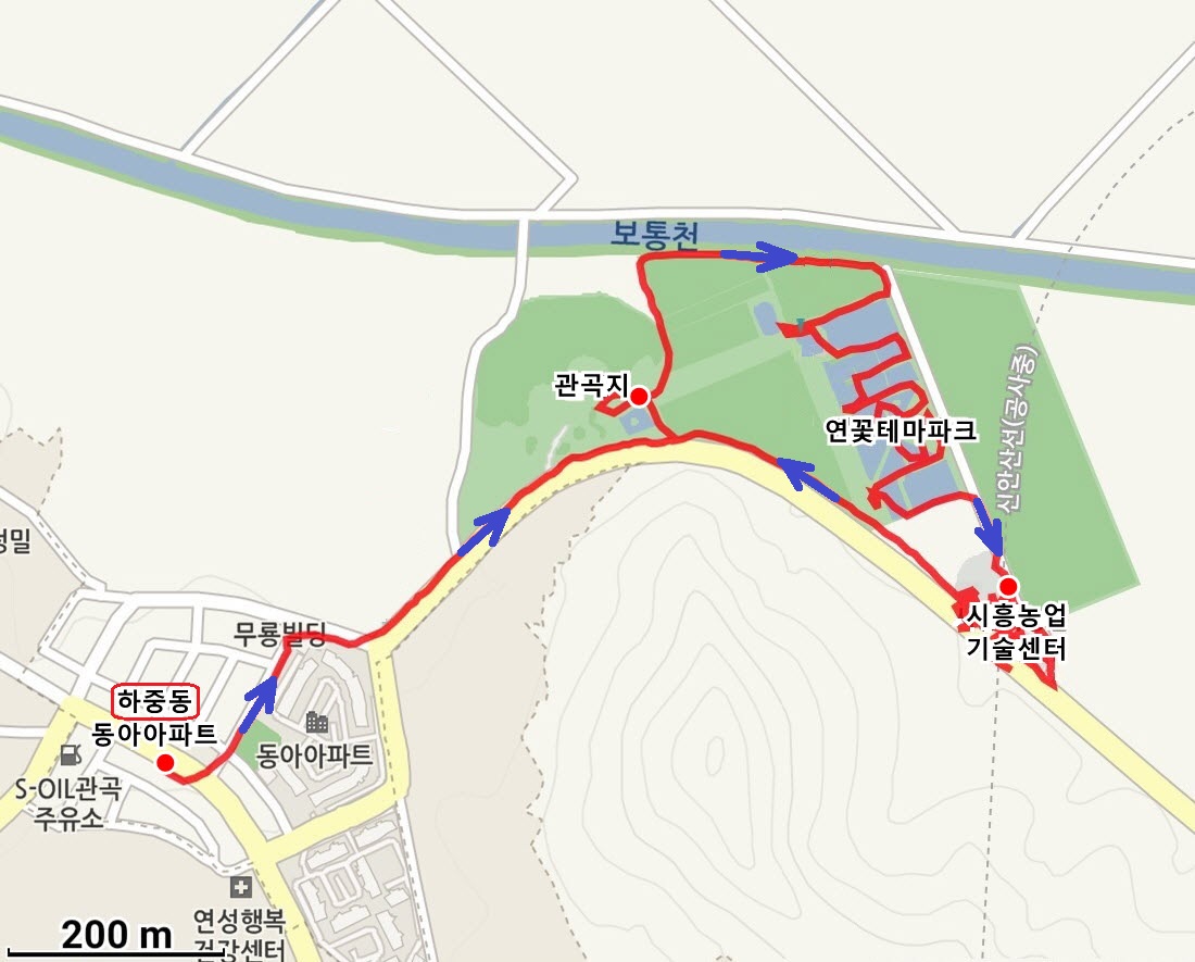 ♣ 코스 : (하중동/동아아파트-)관곡지-<연꽃테마파크>-관곡지 <2.6km+접근 0.6km=3.2km>